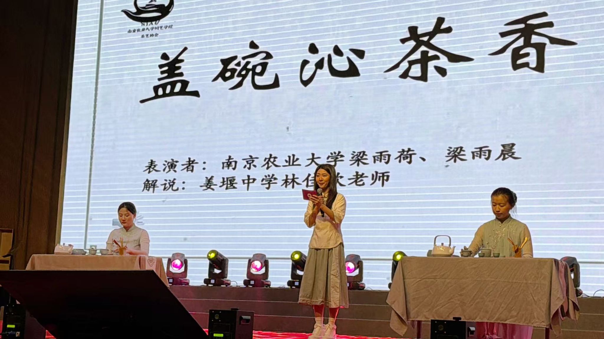 随着悠扬的古乐响起,茶艺协会的同学们身着素雅茶服,行止从容,在舞台上开启“盖碗沁茶香”主题表演。温具、置茶、冲泡、奉茶……一系列动作行云流水,诠释着中国茶道“和、静、怡、真”的精神内涵。现场茶香四溢,掌声阵阵,传统茶艺的独特魅力深深吸引了在场的每一位师生。